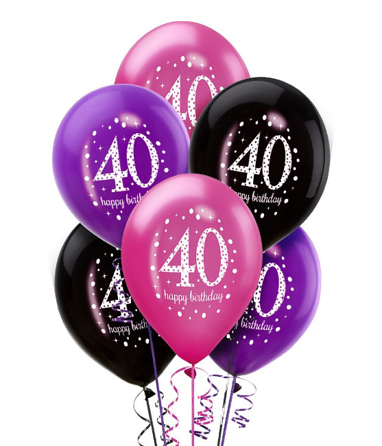 Packung mit sortierten Latexballons in schwarz, lila und fuchsia, mit weißem Zahlenaufdruck. Perfekt für die Dekoration Ihrer Geburtstagsfeier.