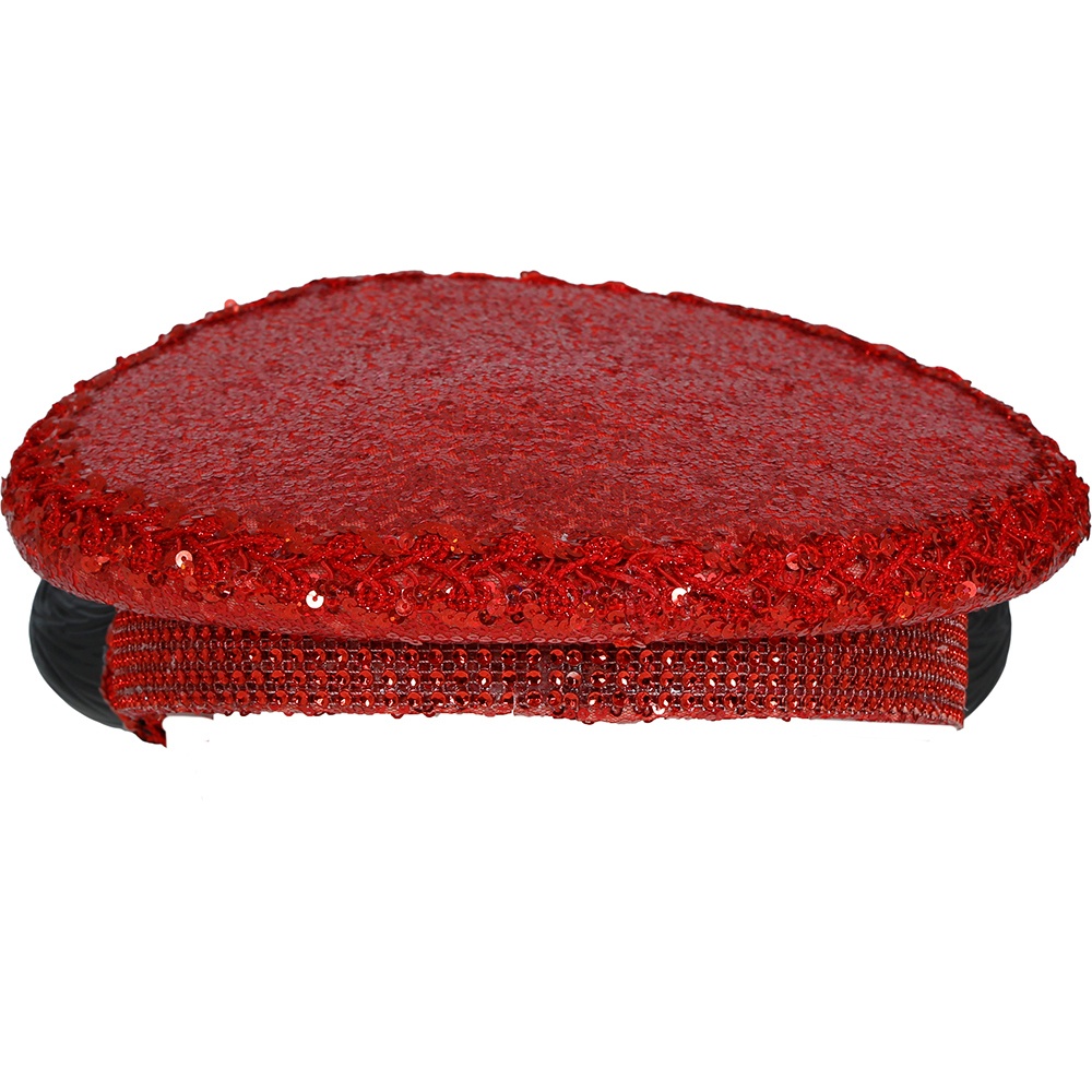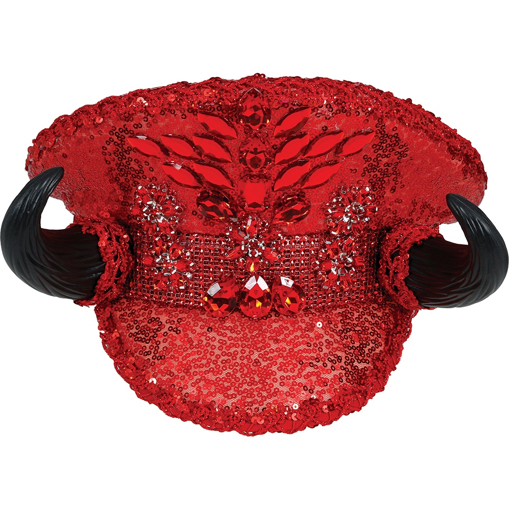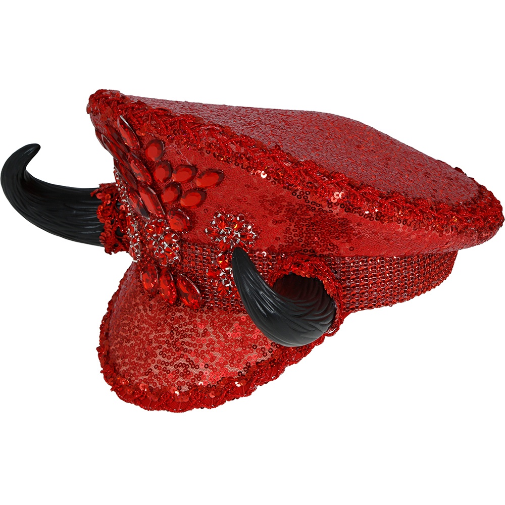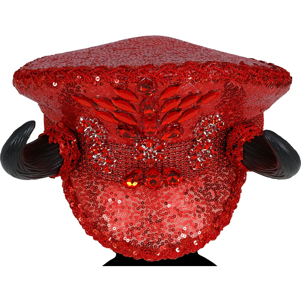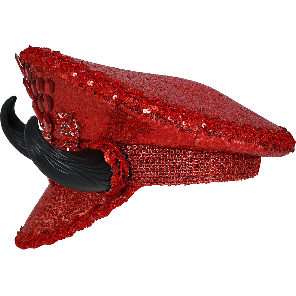Rote Polizeimütze mit Pailletten, Strasssteinen und Hörnern