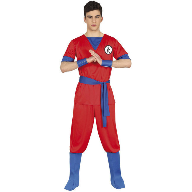 Dieses charakteristische Kostüm besteht aus einem roten T-Shirt mit blauem Schirm und Ärmeln mit orientalischem Aufdruck auf der Vorderseite, kombiniert mit einer Hose mit elastischem Bund. Die Stiefelüberzüge, die Handgelenke und der Gürtel sind ebenfalls in Blau gehalten, um das Outfit dieser klassischen Manga-Figur authentisch wirken zu lassen.