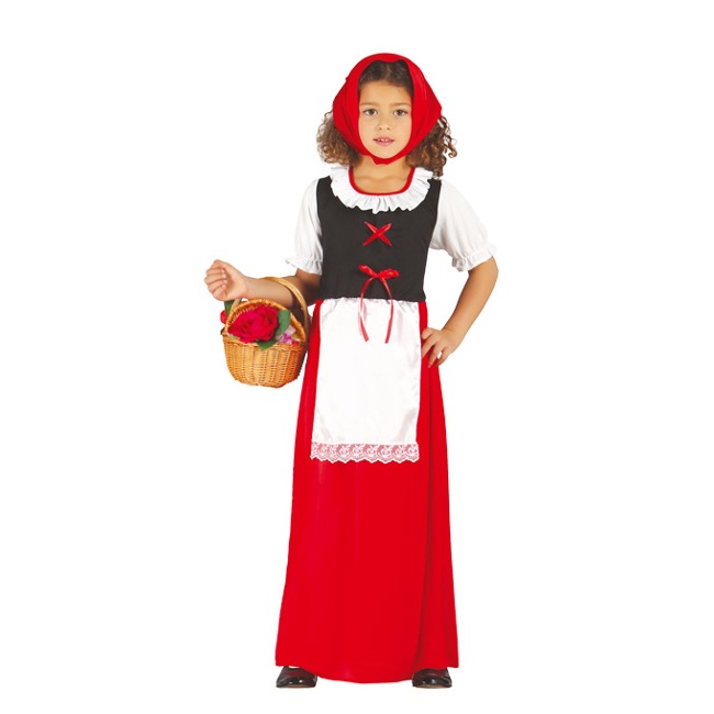 Schäferin- oder Gastwirtin-Kostüm, bestehend aus einem Kleid in Form eines schwarzen Mieders mit weißen Ärmeln und Kragen und einem langen roten Rock. Dazu gehört eine weiße Schürze mit Spitze, die am Kleid befestigt ist. Komplett mit einem roten Kopftuch.