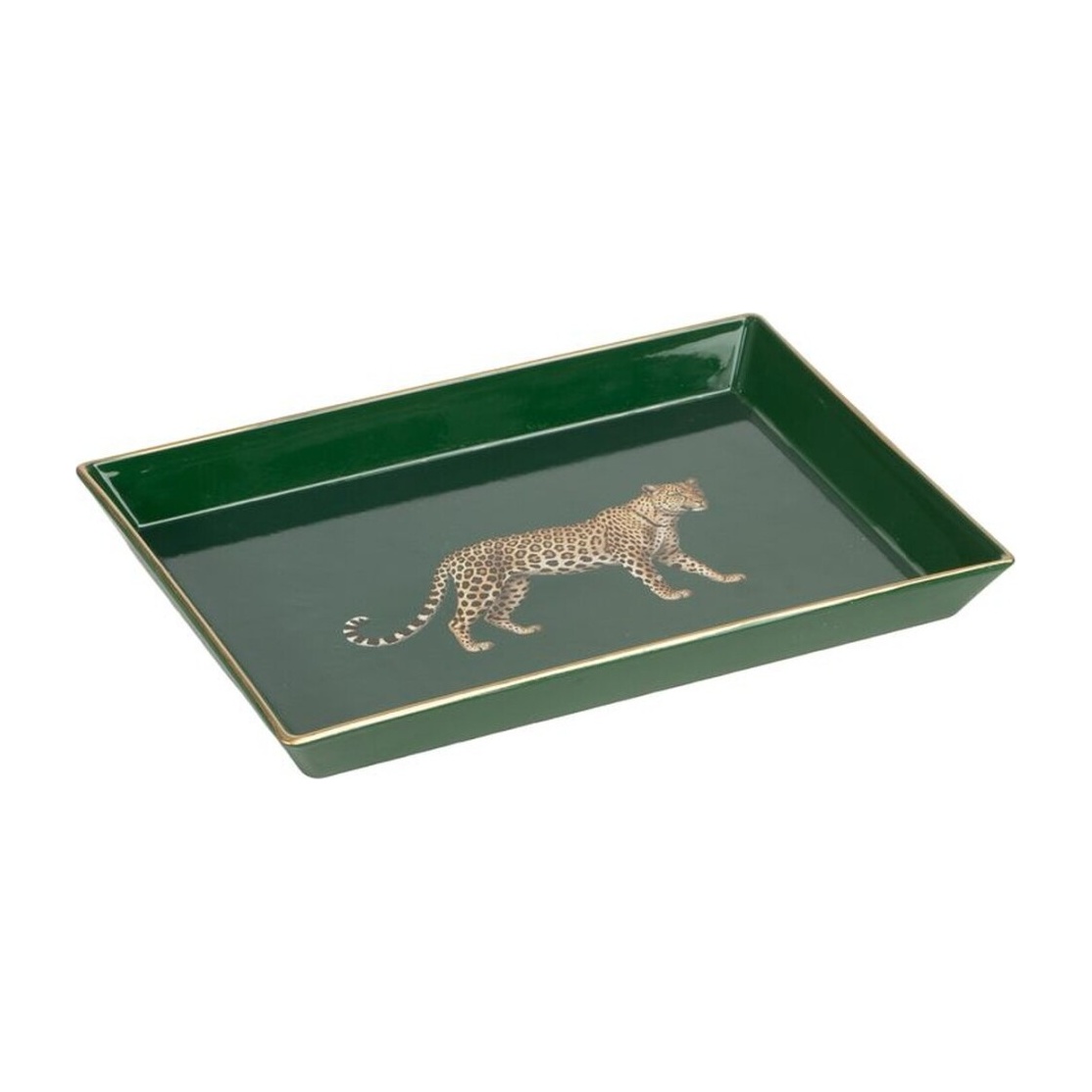 Elegante Ablageschale im Luxury-Stil in tiefem Grün mit goldenen Details, gestaltet mit einem goldenen Gepardenmotiv, das eine raffinierte Note hinzufügt.