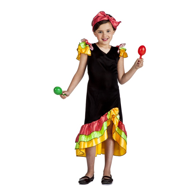 Dazu gehört ein roter Schal mit weißen Punkten, der zu einigen Teilen des Kleides passt und den man sich auf den Kopf setzen kann. Mit ein paar Maracas und wenig anderem kannst du ein lustiges Ensemble zusammenstellen, wenn du es mit dem der Männer, Mädchen oder Jungen kombinierst.