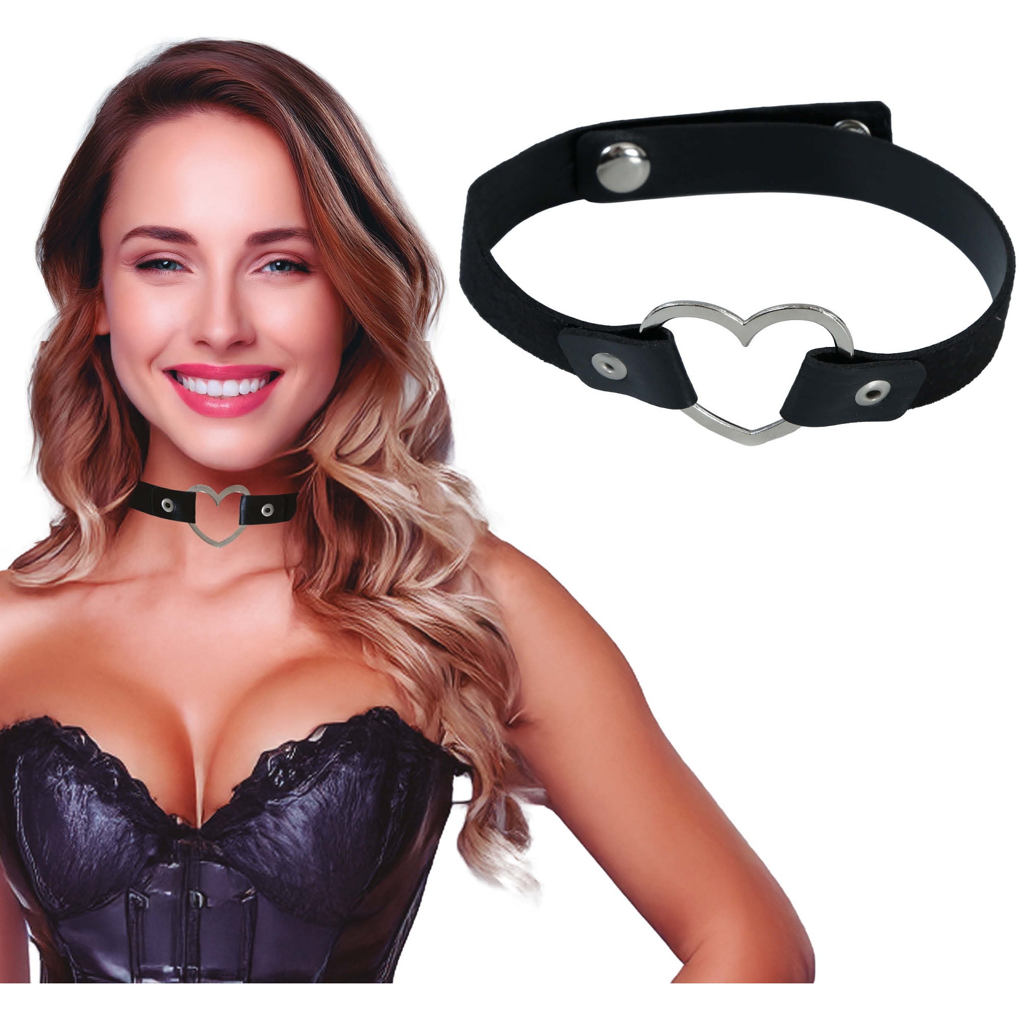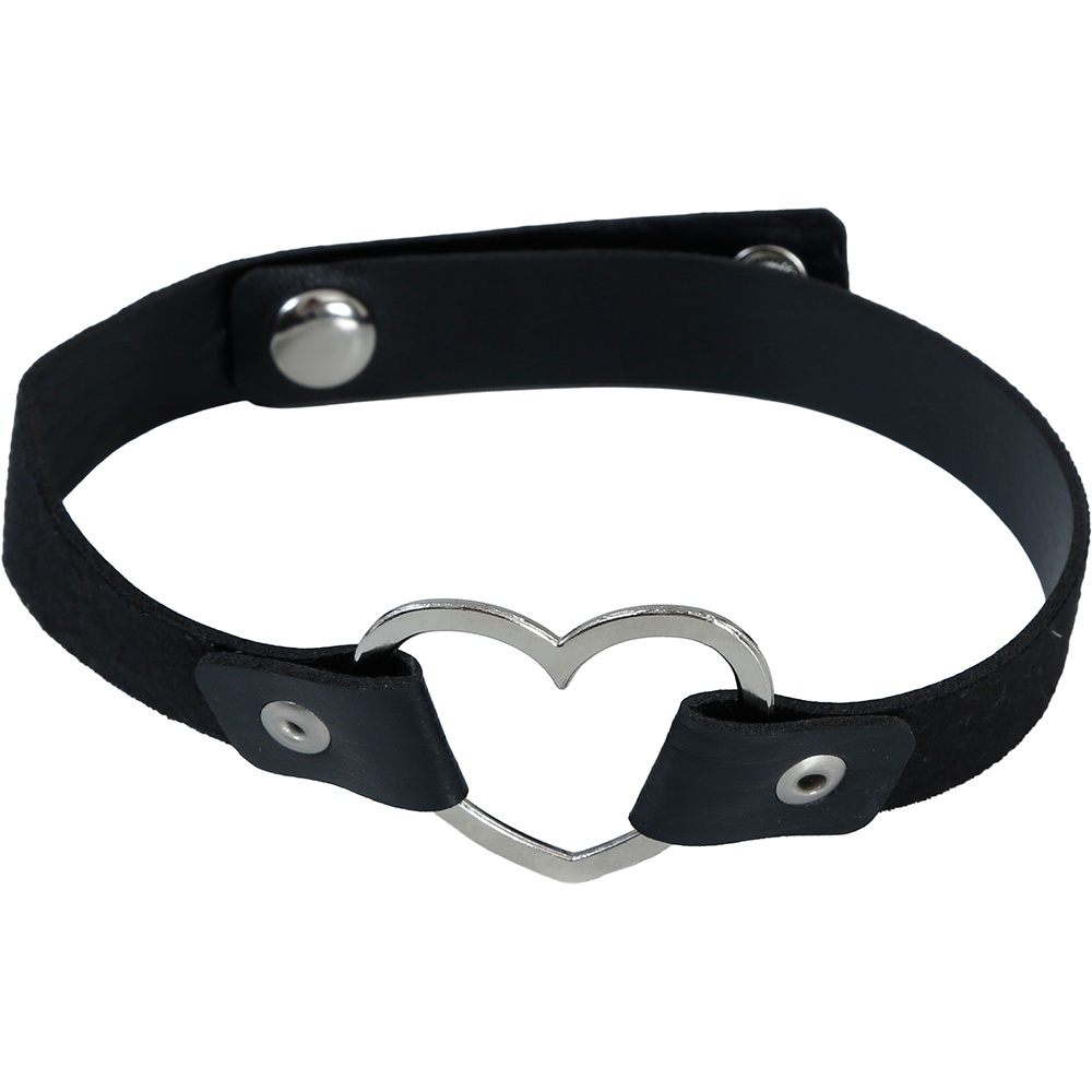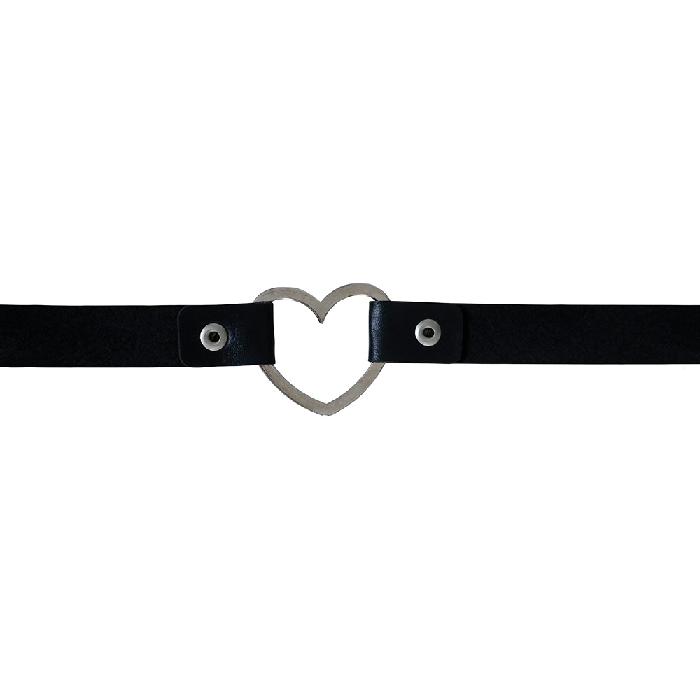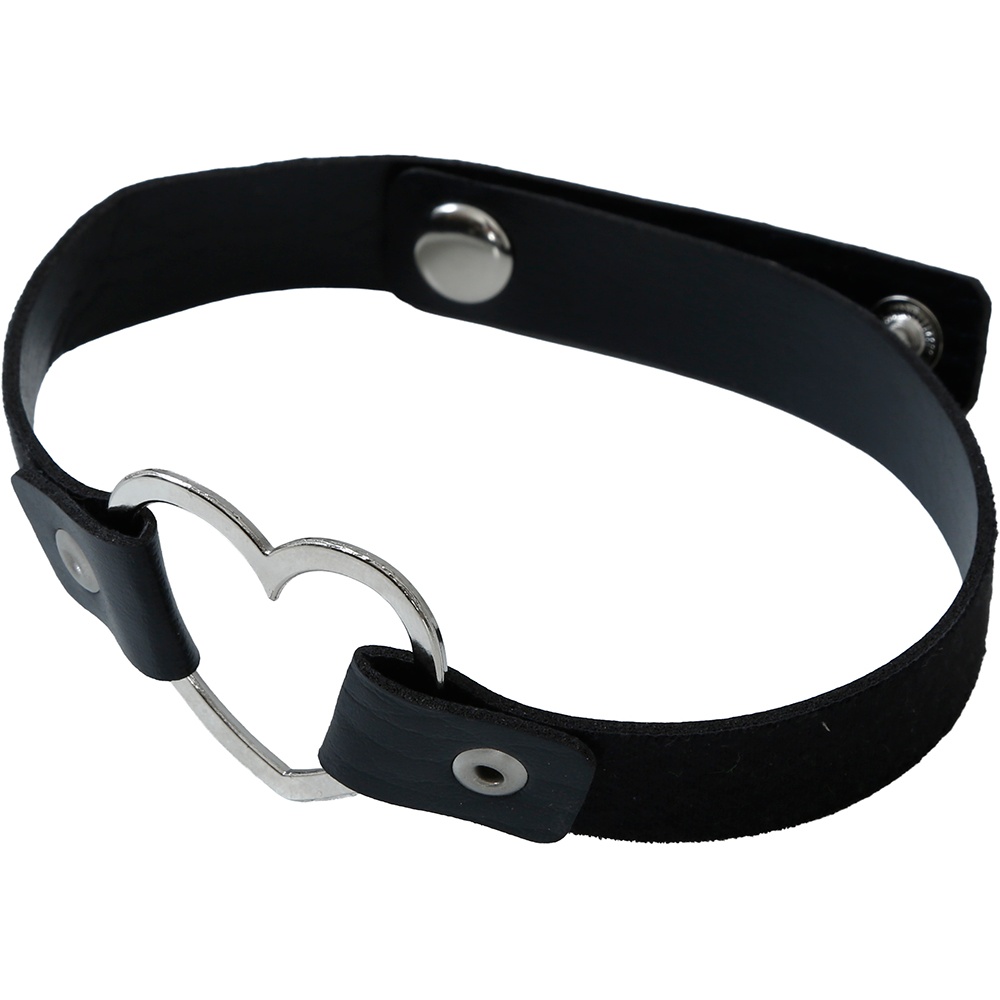 Sado-Choker, konzipiert für Abschiede und besondere Nächte. Die mittige, herzförmige Metallapplikation verleiht einen gewagten und eleganten Akzent. Das Band ist mittels Druckknöpfen verstellbar, sodass er Ihnen sicheren und komfortablen Halt bietet. Ein sinnliches Accessoire, das Ihre Dessous und intimen Looks wirkungsvoll unterstreicht.