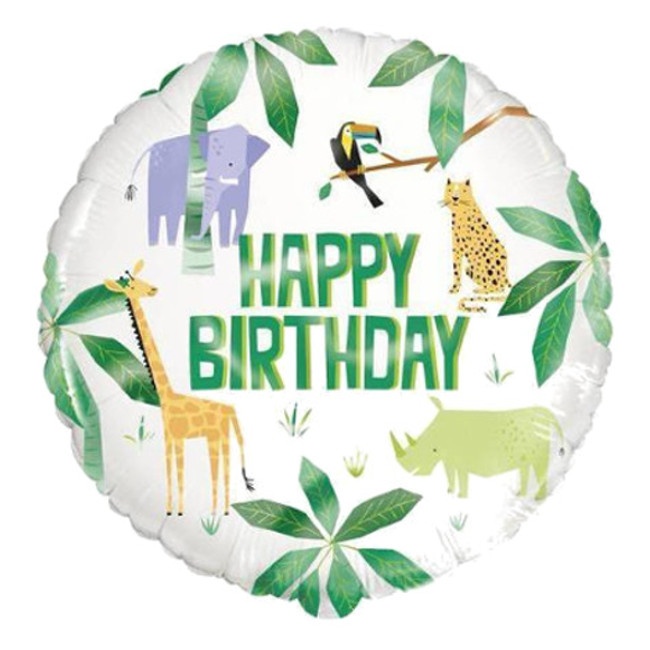 Folienballon zur Dekoration der Geburtstagsparty Ihres Kindes mit Tieren. Weiß und mit dem Text Happy Birthday, verziert mit Tieren, die für den Dschungel oder Safari stehen, wie eine Giraffe, ein Tukan, ein Nashorn, ein Elefant und ein Leopard.