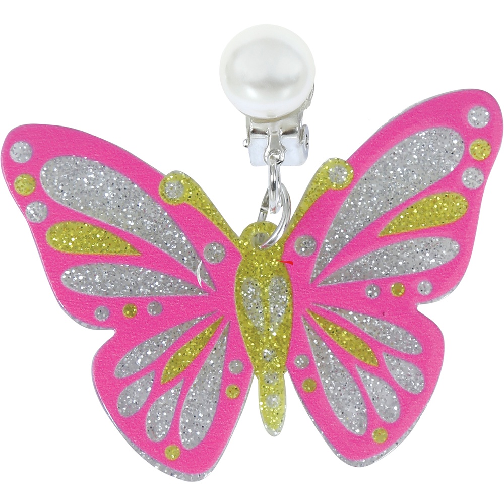 Zauberhafte Schmetterlings-Ohrringe speziell für Mädchen. Das auffällige Rosa und die glitzernden Akzente sorgen für einen festlichen, funkelnden Look. Leicht und angenehm zu tragen - ideal für Partys, Geburtstage und als Kostüm-Accessoire. Die Ohrringe besitzen einen Clipverschluss mit Perlendetail, lassen sich einfach anbringen und sind sicher für nicht durchbohrte Ohren. Materialien: Metall und PVC.