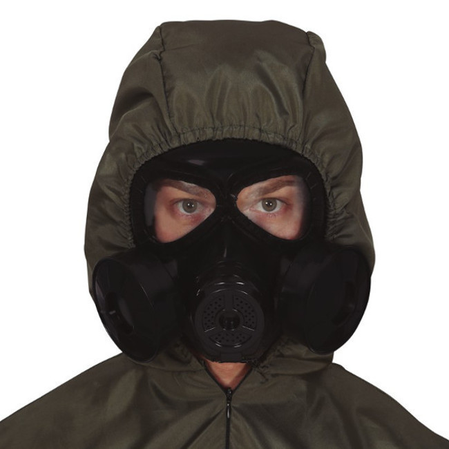 Das Produkt besteht aus einer Maske, die die Form einer Gasmaske hat. Sie ist an den Enden mit Gummibändern versehen, um sie an Ort und Stelle zu halten.