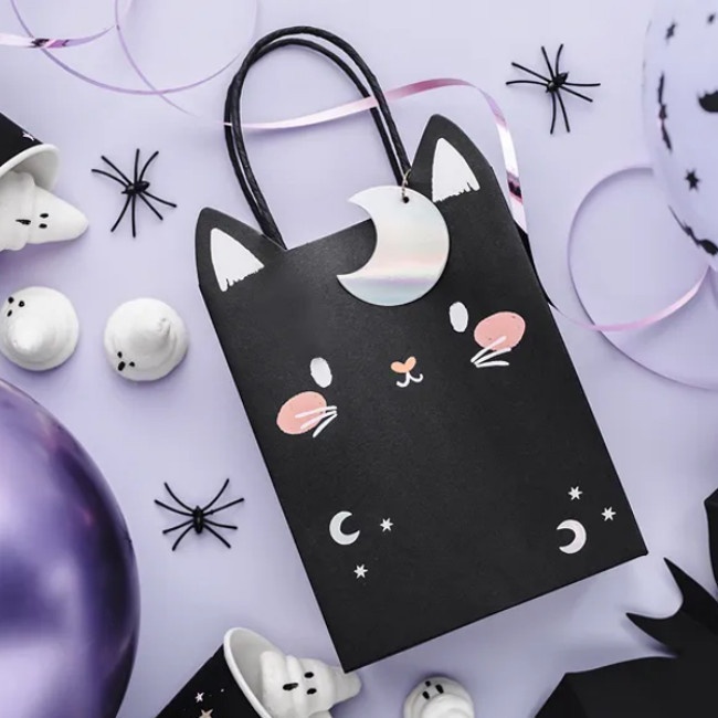 Hübsche Tasche, um eine Kleinigkeit in Form einer schwarzen Katze zu verschenken. Mit einer mondförmigen Karte, die an einem der Griffe hängt, und einer schönen Farbe im Inneren.