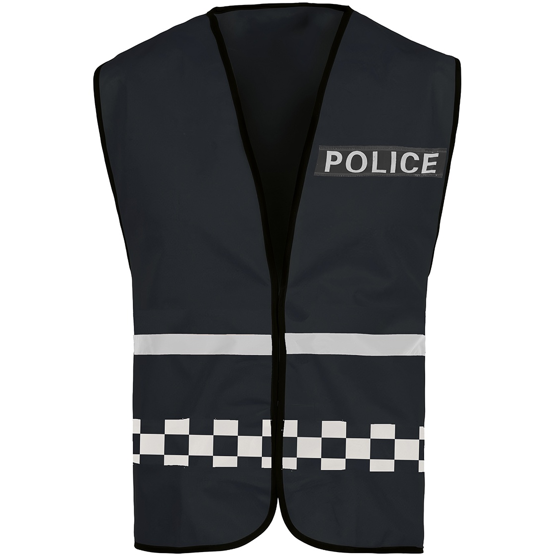 Schwarze Polizeiweste für Erwachsene mit "POLICE"-Aufdruck und reflektierenden Streifen für ein realistisches Erscheinungsbild. Aus leichtem Polyester gefertigt bietet sie Komfort und eine überzeugende Optik zur Ergänzung jedes Polizei-Looks. Das ärmellose Design mit Frontöffnung ermöglicht das einfache Tragen über der Kleidung. Perfekt für Partys, Karneval und Themen-Events, wenn Sie ein authentisches und einfach zu verwendendes Accessoire suchen.