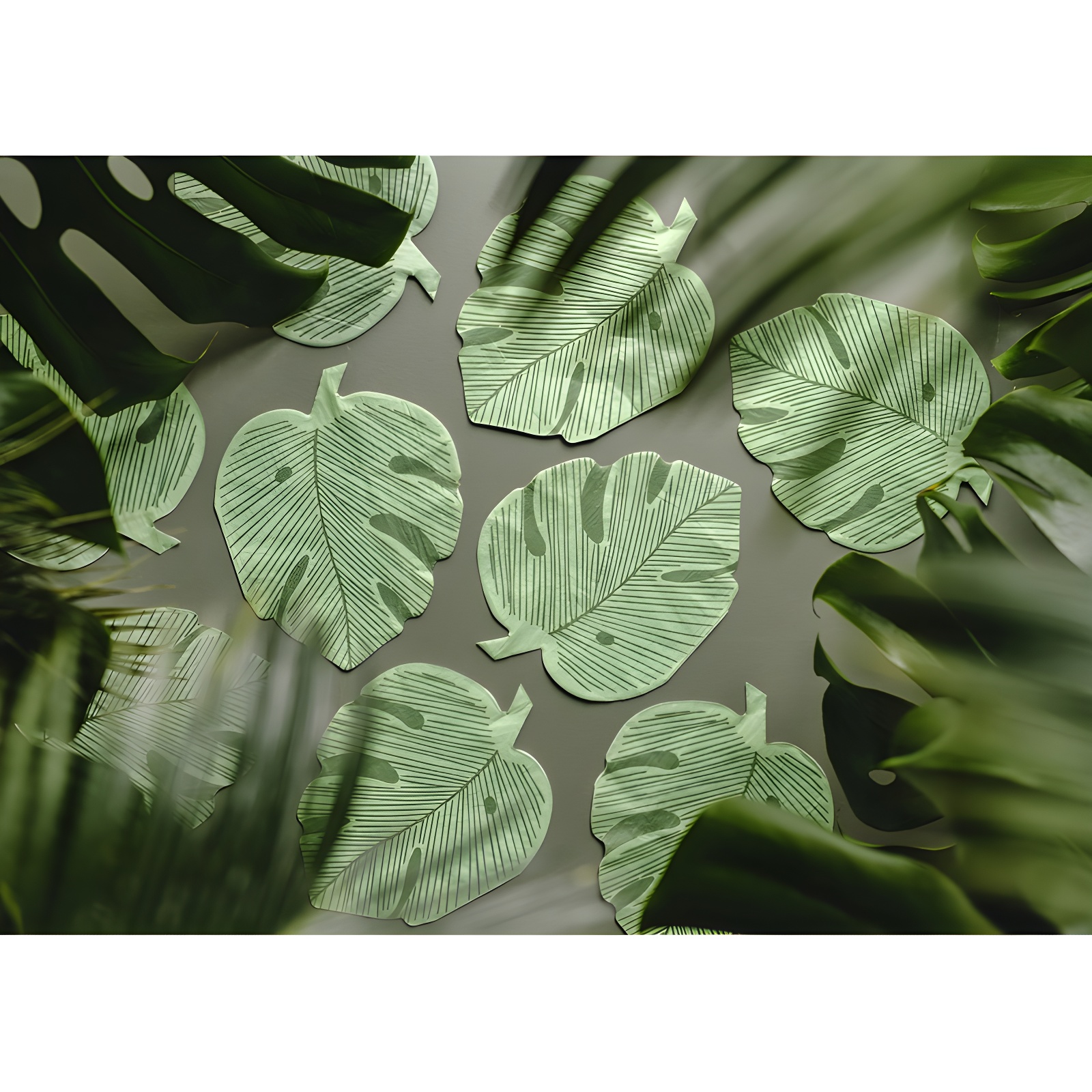 Papierservietten mit Monstera-Blattmotiv, die Ihrem Tisch eine tropisch-moderne Note verleihen.