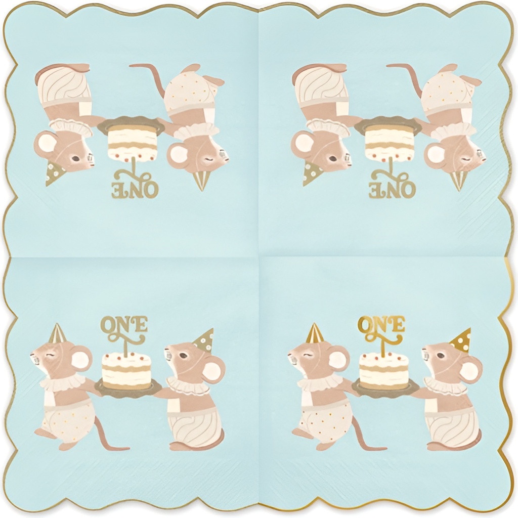 Zweilagige Papierservietten mit einem zarten Mäusemotiv und dem Schriftzug "ONE" auf blauem Hintergrund. Maße: aufgeklappt 33 x 33 cm, gefaltet 16,5 x 16,5 cm. Süßes, elegantes Design - perfekt, um den ersten Geburtstag stilvoll zu feiern. Praktisch verpackt im kompakten Beutel, ideal zum Dekorieren Ihres Tisches und zur Kombination mit der restlichen Party-Papeterie.