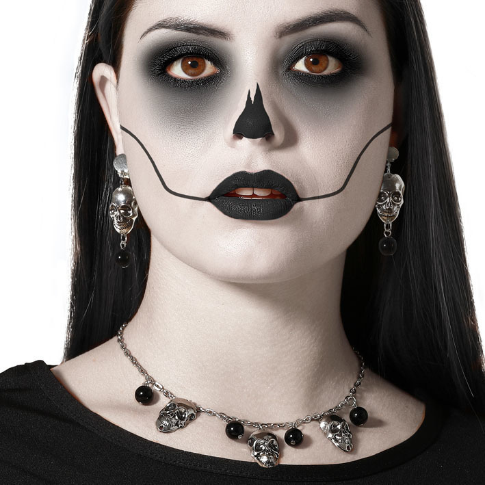 • Halskette mit silbernem Schädelanhänger und passenden Ohrringen. Perfekt für gotische Stile, Hexen oder eleganter Tod.