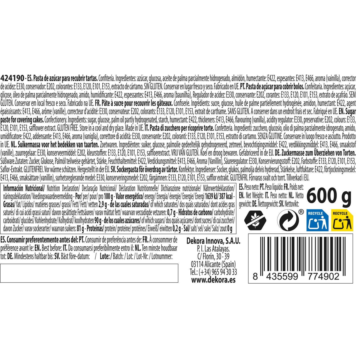 Zutaten: Teilweise hydriertes Pflanzenöl, Stärke, Aroma (Vanille), Zucker, Saflorextrakt, Glucose, Farbstoffe: E101, E120, E133, E153, Verdickungsmittel: E413, E466, Feuchtigkeitsmittler: E422, Säuerungsmittel: E330, Konservierungsmittel: E202.