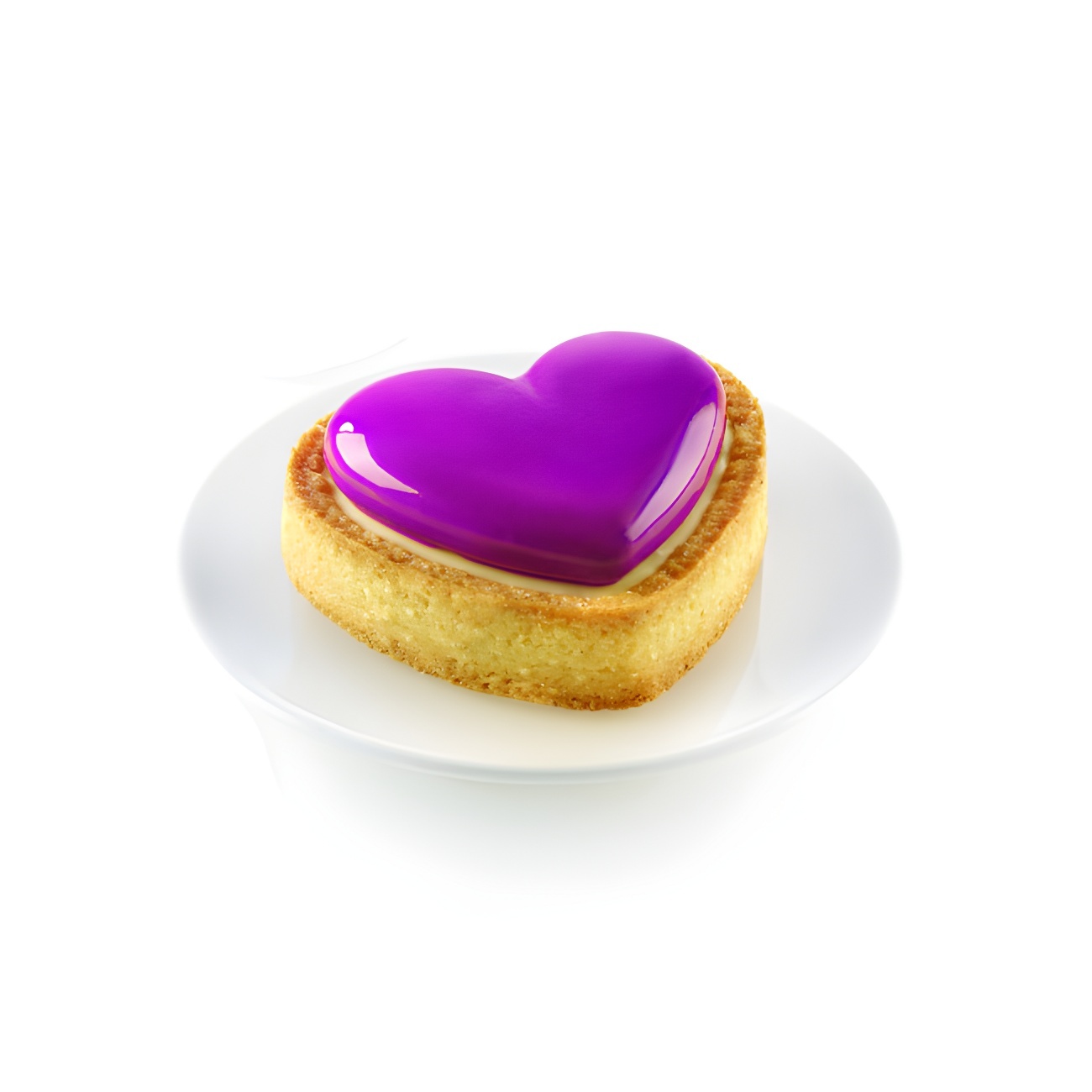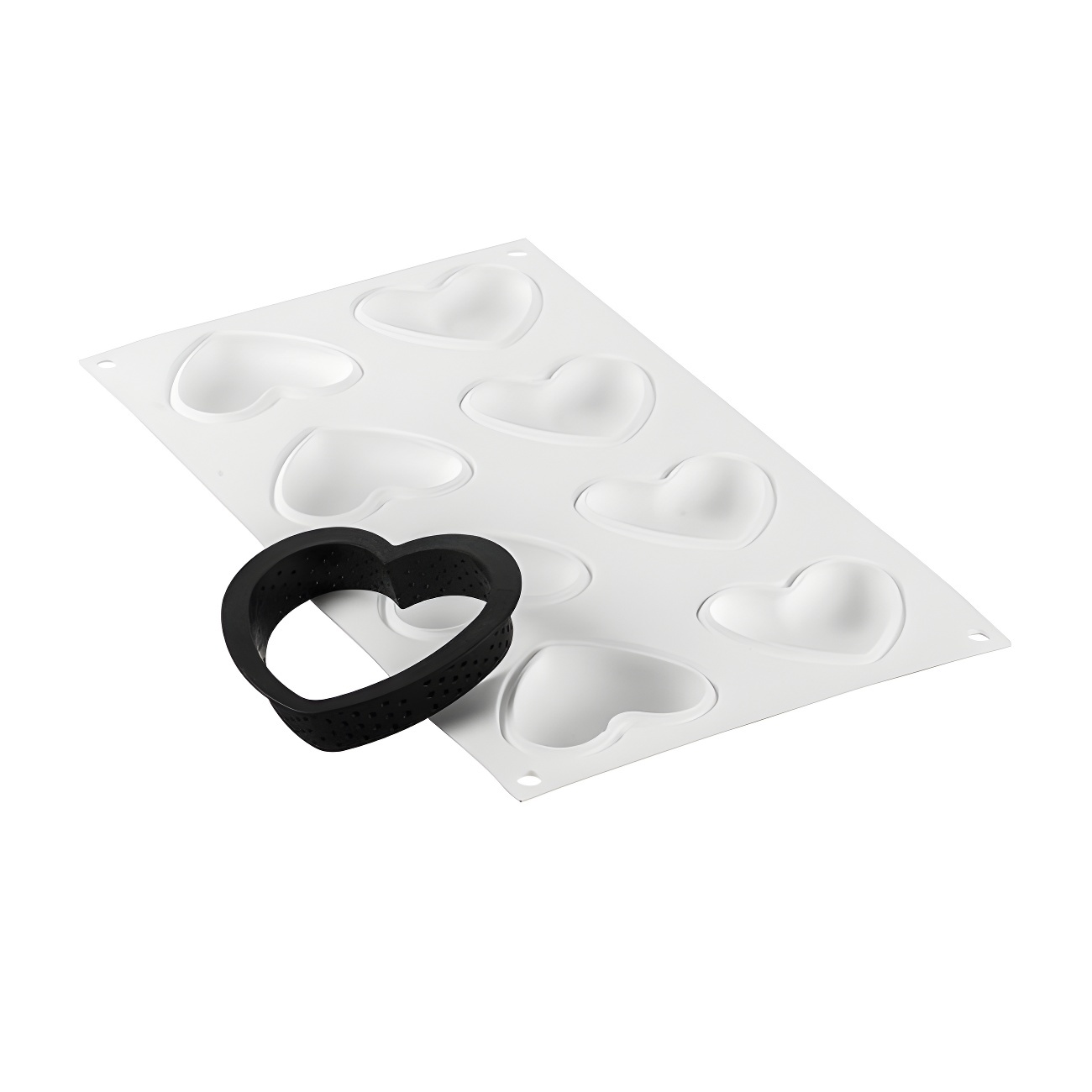 Set zur Herstellung von Mini-Desserts in Herzform. Es besteht aus einer Silikonform mit 8 Mulden für die obere Herzhälfte und 8 thermoplastischen Formen für die Böden.