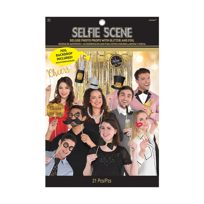 Mit diesem Set aus Wandbild und Zubehör für Silvesterpartys gelingen Ihnen die lustigsten Fotos und Selfies.