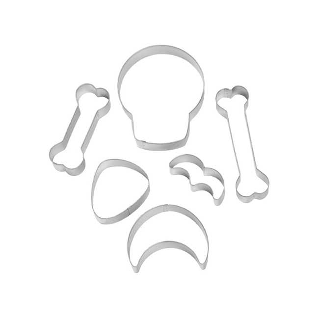 Set mit 6 Metallausstechern, um ein Skelett zu kreieren, indem man alle Ausstecher benutzt oder sie einzeln verwendet, ideal für Halloween. Das Set besteht aus Ausstechern in Form von: Schädel, Mond, Fledermaus, großem Knochen, kleinem Knochen und Candy Corn.