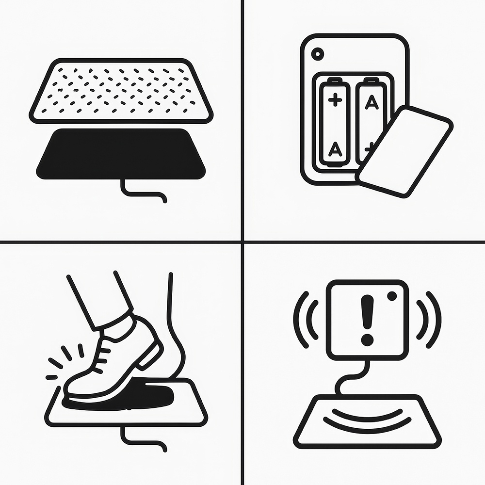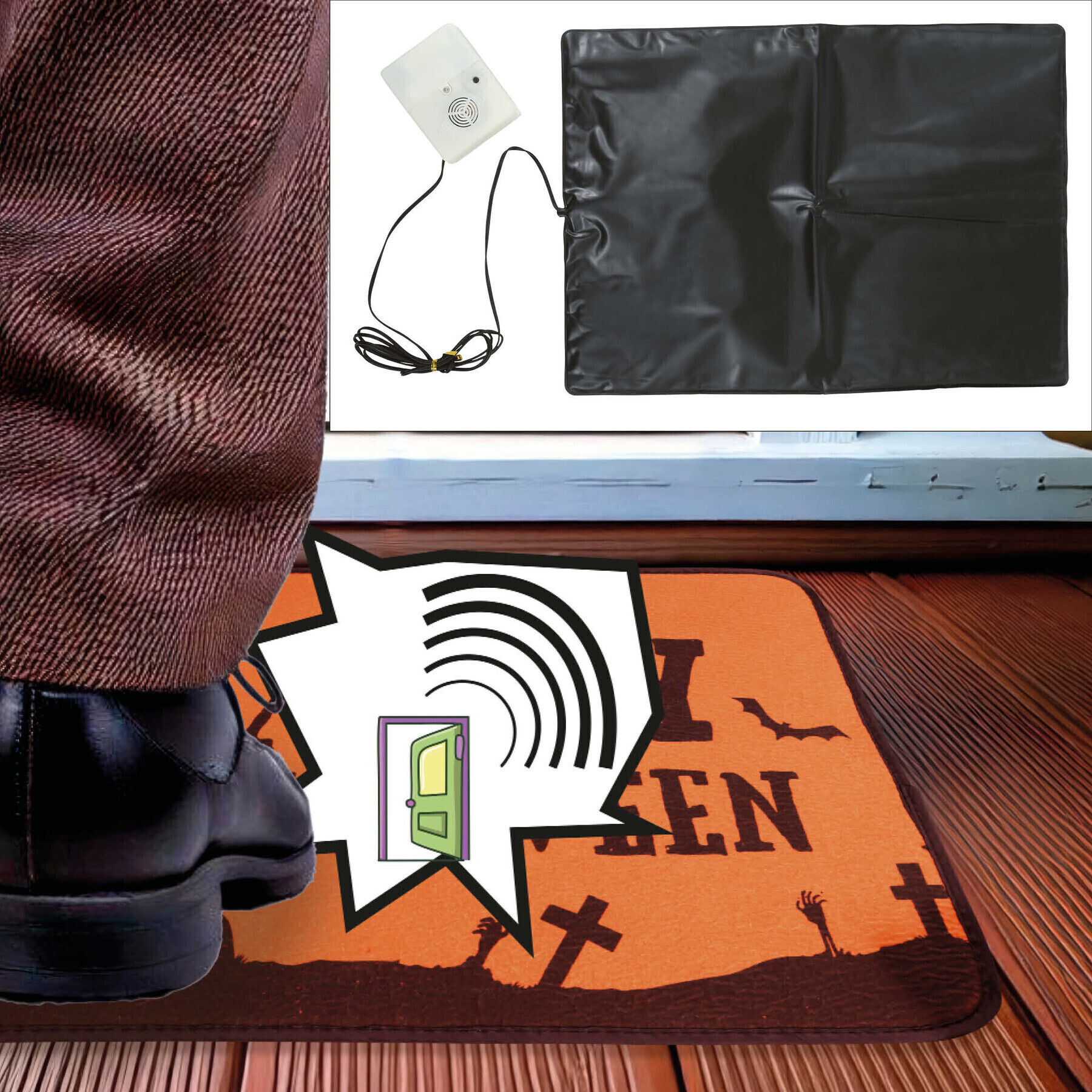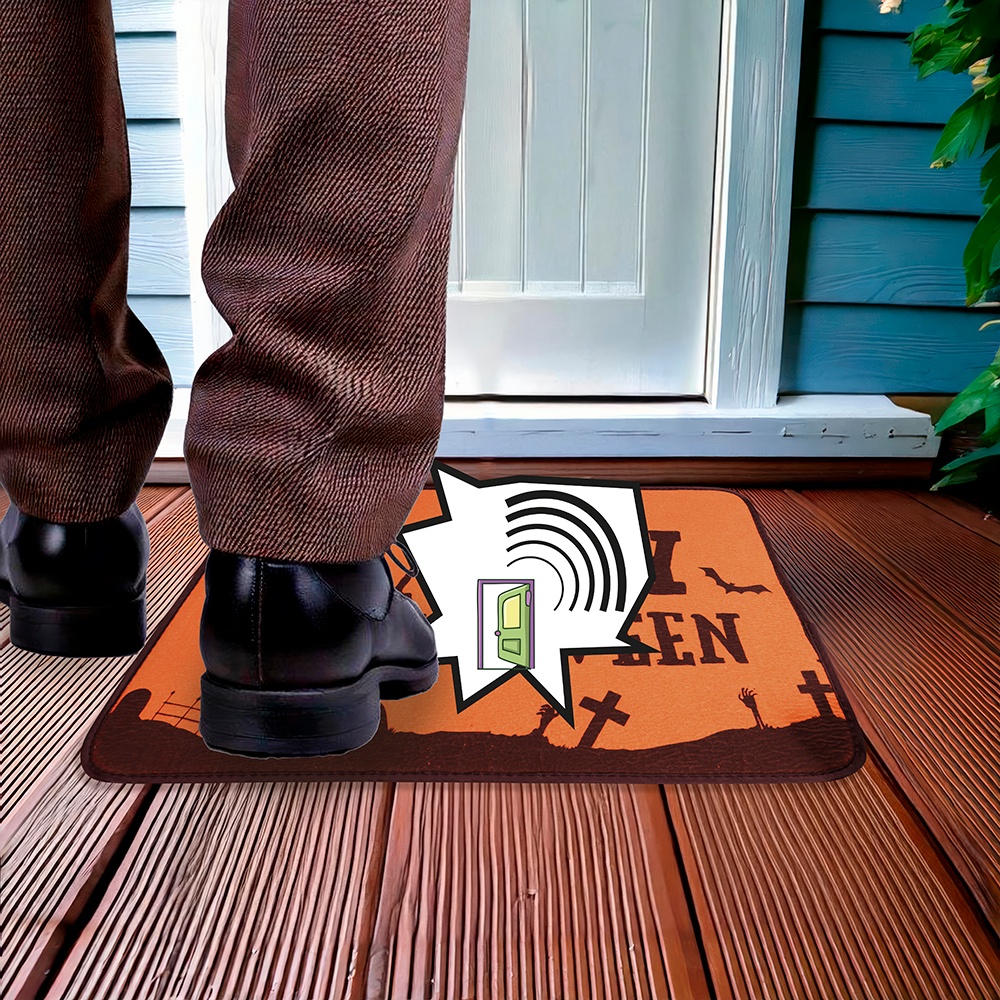 - Wird unter der Fußmatte mit einem Sensor platziert, der bei Betreten einen Halloween-Klang abspielt.