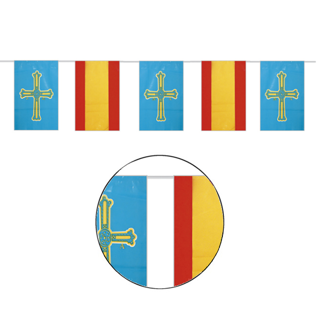 Dieses Band besteht abwechselnd aus den Flaggen Spaniens und Asturiens, die eine Girlande bilden, mit der Sie aufgrund ihrer Länge jede Party, jeden Veranstaltungsort oder jede Straße dekorieren können.