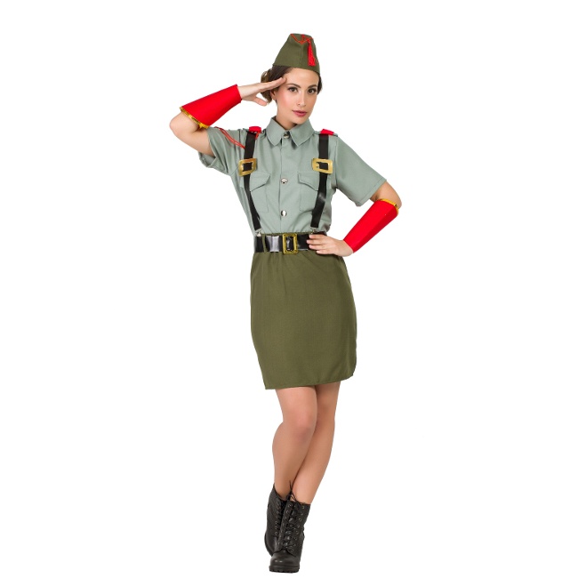 Charakteristisch sind die roten Armbinden und die Militärmütze oder -kappe, die auch in das Outfit der Frauen integriert sind.