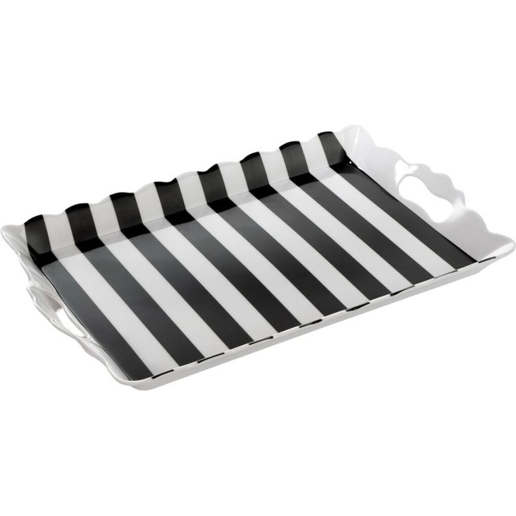 Das klassisch gestreifte Schwarz-Weiß-Design verleiht Ihrem Tisch einen modernen und raffinierten Touch. Dank des kompakten Formats und der integrierten Griffe ist das Tablett ideal zum Servieren von Appetithäppchen und zur stilvollen Präsentation bei Veranstaltungen. Perfekt zur Kombination mit kontrastreichem Geschirr, um ansprechende Tischarrangements zu schaffen.