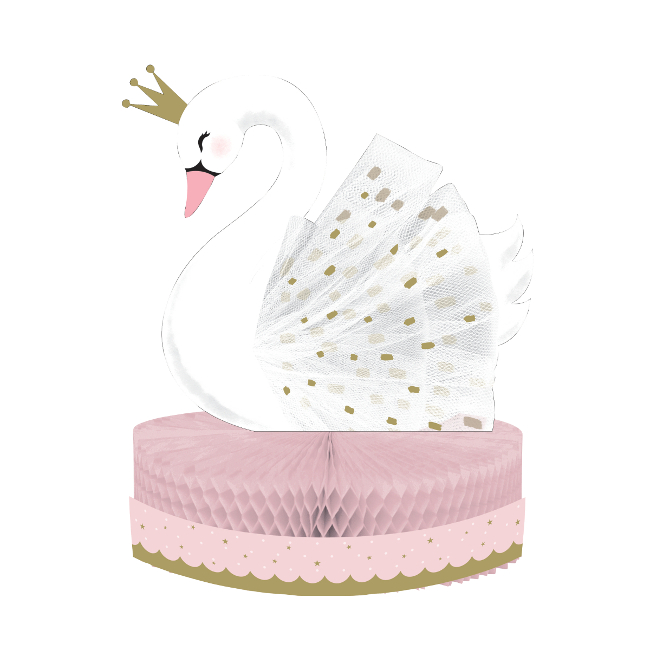 Zauberhafter Tafelaufsatz, bestehend aus einer 8 cm hohen rosa Bienenplatte und einem schwanenförmigen Karton mit goldenen Motiven darauf.