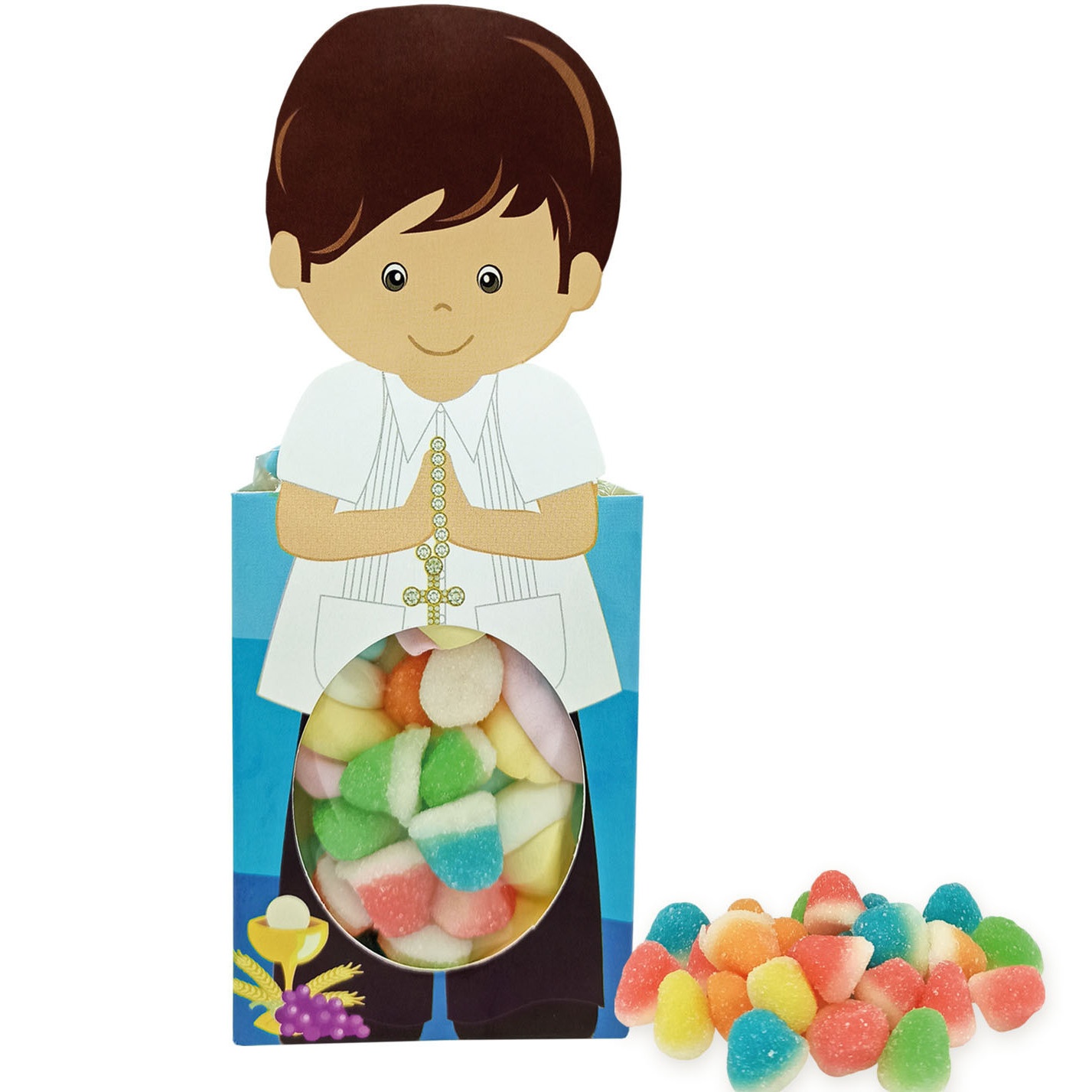 Kleine Schachtel in Form eines Kommunionsjungen, gefüllt mit Gummibonbons und Schaumzucker.