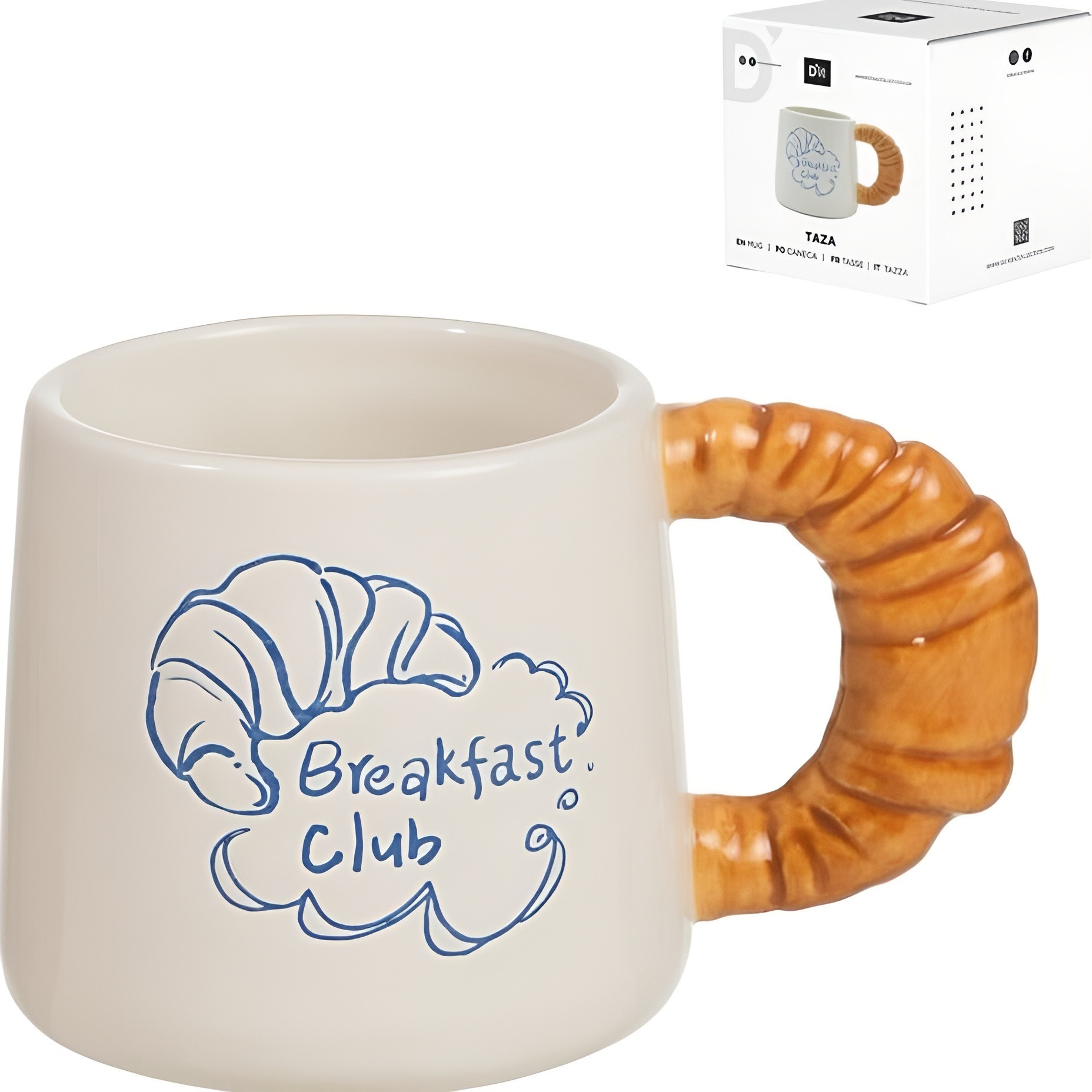 Originelle Frühstückstasse mit Croissant-Henkel, die Ihnen morgens eine verspielte und besondere Note verleiht. Mit 380 ml Fassungsvermögen ist sie ideal für Ihren Kaffee, Tee oder heiße Schokolade. Das Design enthält die Illustration "Breakfast Club", die ihren lässigen, gemütlichen Stil unterstreicht. Ein markantes Stück für Ihr Geschirr - auch ideal, wenn Sie ein Geschenk für jemanden suchen, der Gebäck und casual Design schätzt.