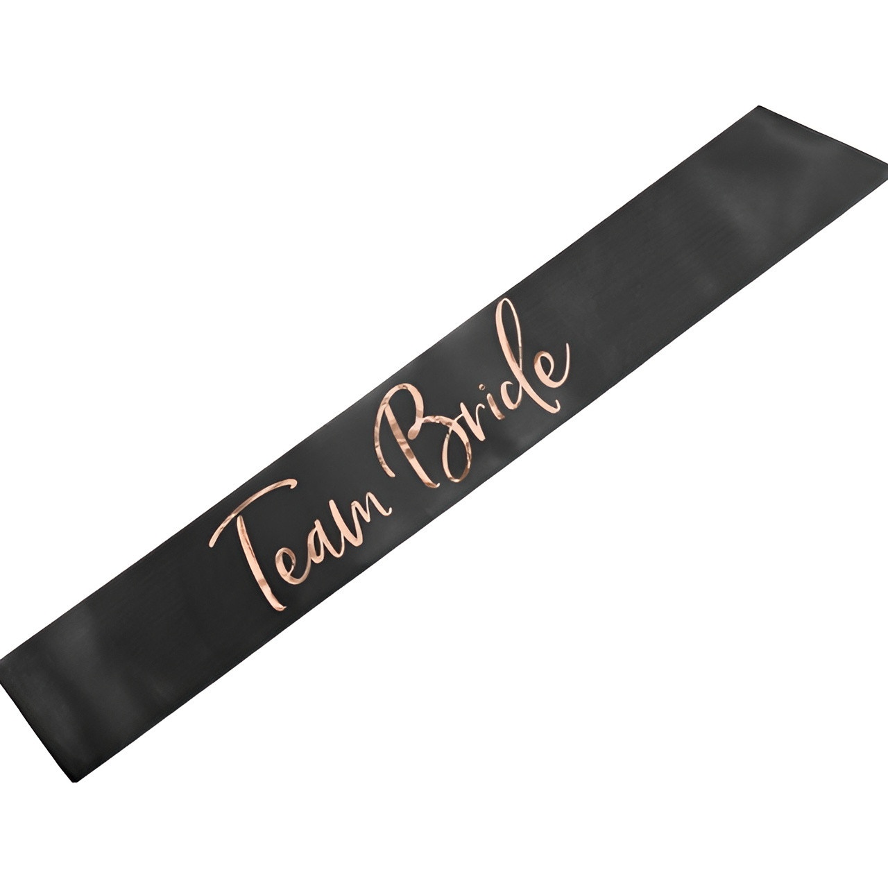 Team Bride aus schwarzem Satin mit eleganter roségoldener Prägung, die einen schicken, festlichen Akzent setzt. Ca. 75 cm lang und 10 cm breit, mit glänzendem Finish und einer stilvollen Schrift, die auf Fotos und bei Feiern besonders hervorsticht.