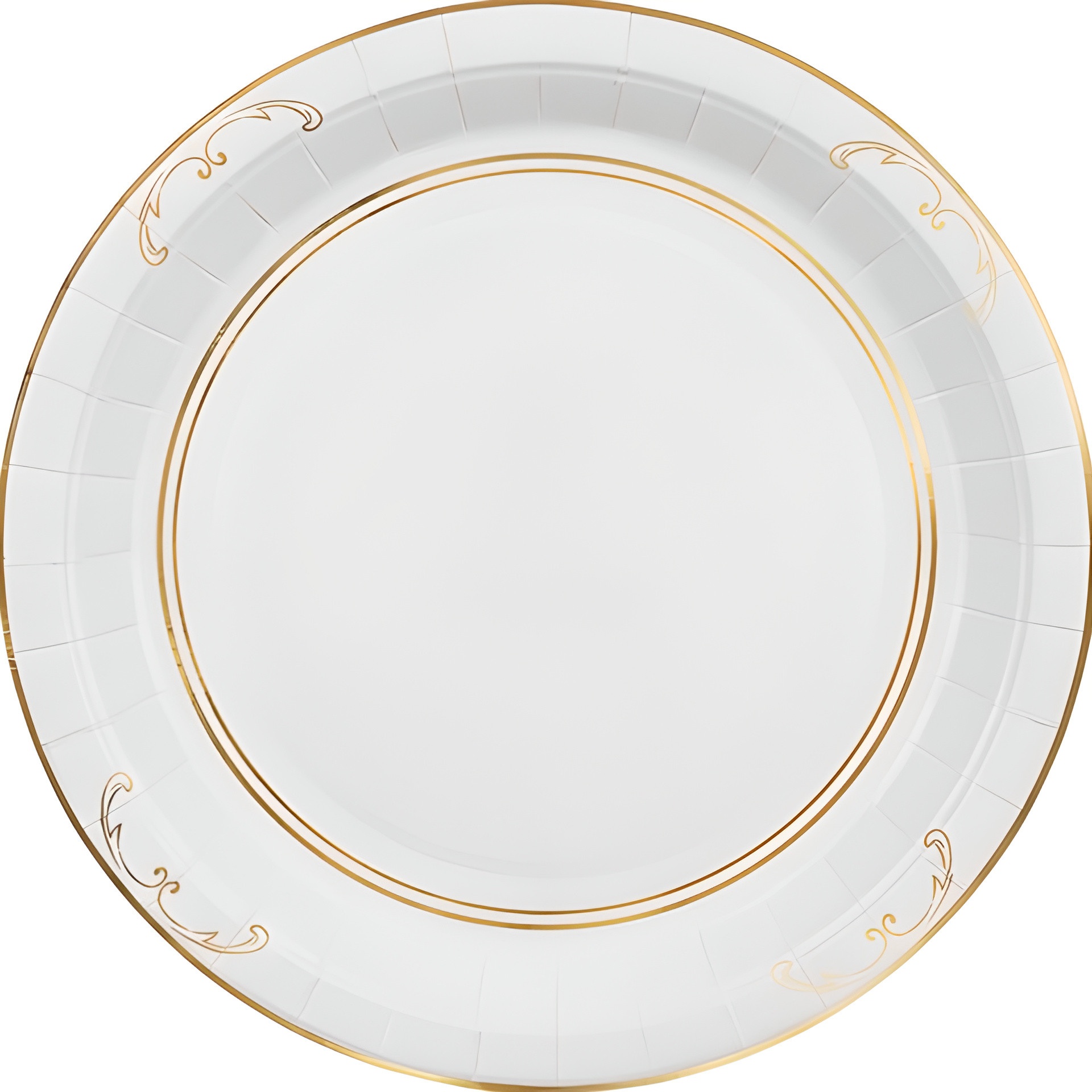 Weiße, runde Teller mit filigraner Goldornamentik, die jeder Tafel eine gehobene Note verleiht. Mit einem Durchmesser von ca. 23 cm ideal für Feierlichkeiten und stilvolle Events. Klassisch-neutrales Design, das sich mühelos in verschiedene Tischkonzepte und Farbstellungen einfügt. Perfekt für Hochzeiten, Bankette und Empfänge, wenn Sie ein elegantes Ergebnis ohne Aufwand wünschen.