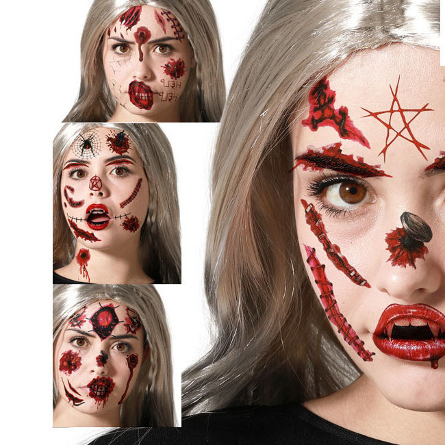 - Tattoos mit Effekten von Verwundungen, satanischen Symbolen und blutigen Markierungen. Ideal für Kostüme wie Zombie, Hexe, Dämon oder Terroropfer.