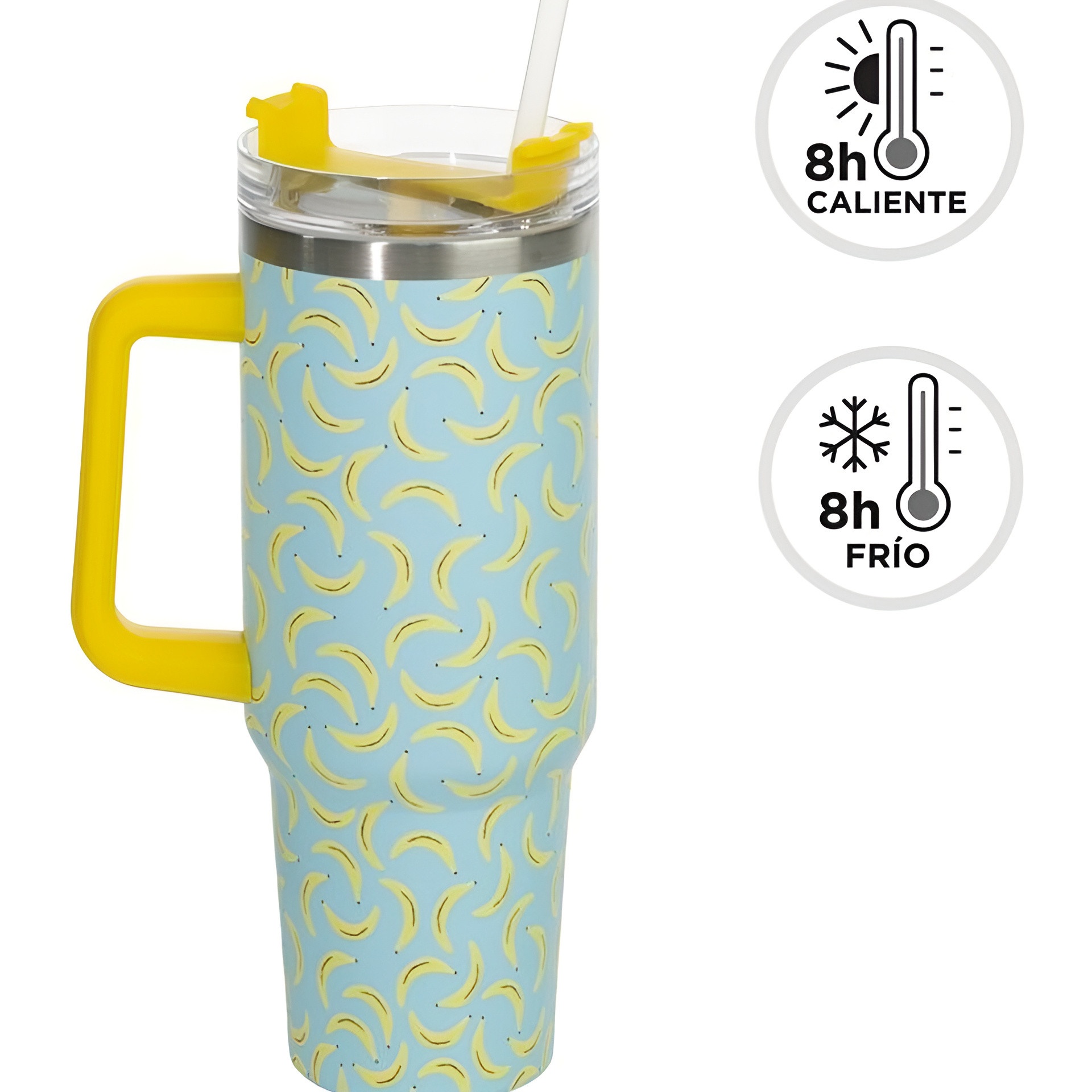 Bunte Oberfläche mit Bananenmuster, die einen sommerlichen, unbeschwerten Touch verleiht. Ideal, um Ihre Getränke tagsüber, im Auto oder bei Aktivitäten im Freien mitzunehmen.