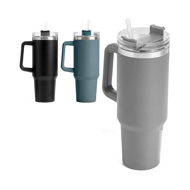 Thermobecher 1,2 L mit Henkel und bunten Strohhalmen - 1 Stück
