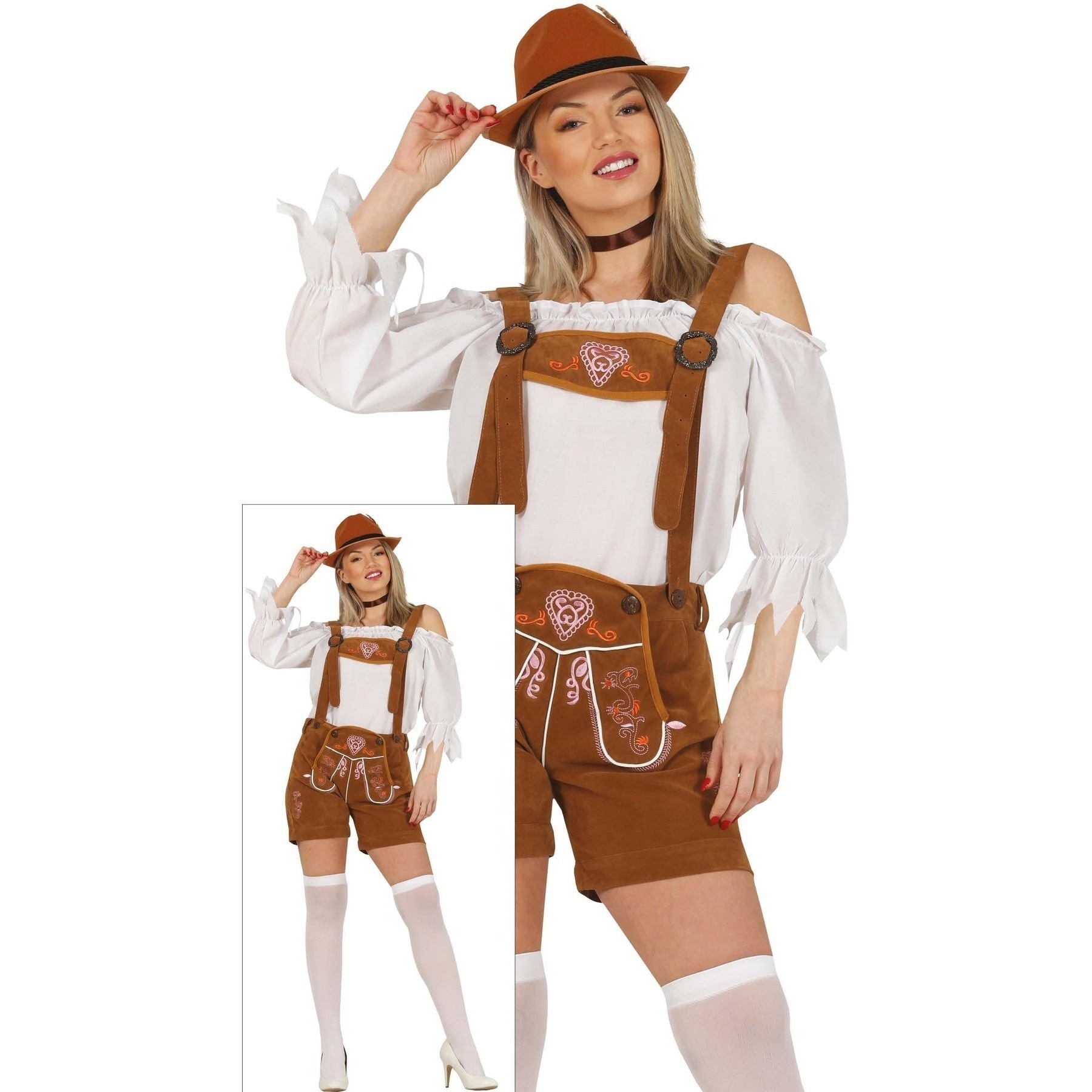 Es handelt sich um ein Paar braune Shorts aus Wildleder mit Hosenträgern. Es wird von einigen Stickereien begleitet, die eine besondere und originelle Note geben.