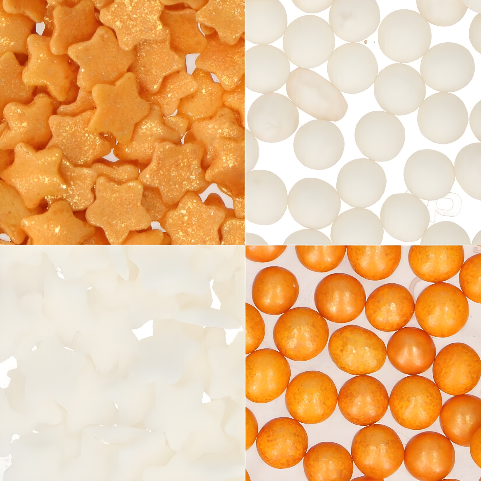 • Weiße Zuckerkugeln, goldene Zuckerkugeln, goldene Sterne und weiße Sterne.