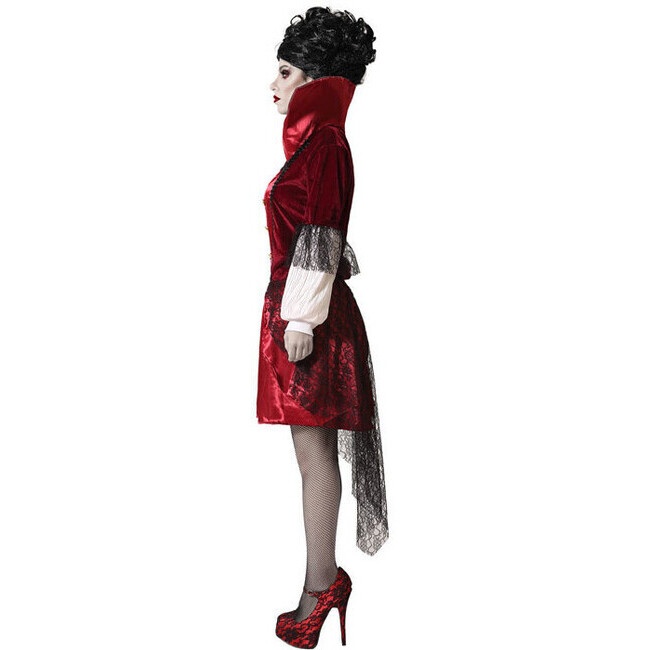 Das Kostüm besteht aus einem burgunderroten Kleid mit schwarzen Tülldetails, einem hohen Ausschnitt, weißen Ärmeln und einem kurzen Rock mit tiefem Rückenausschnitt.