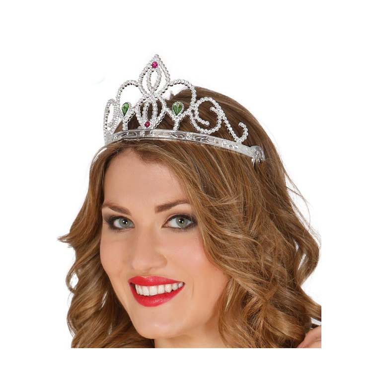 Dies ist ein versilbertes Kunststoff-Diadem mit grünen und rosa Perlen.