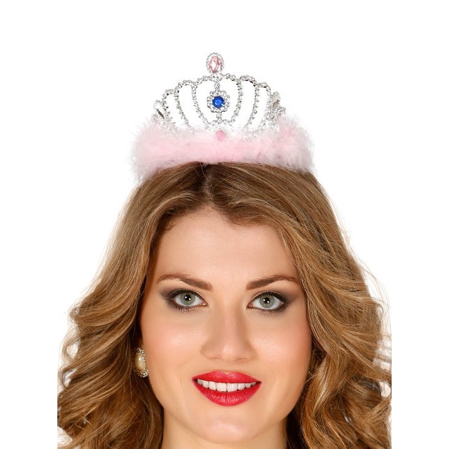 Schönes versilbertes Diadem mit rosa Perlen und rosa Marabu am Sockel.