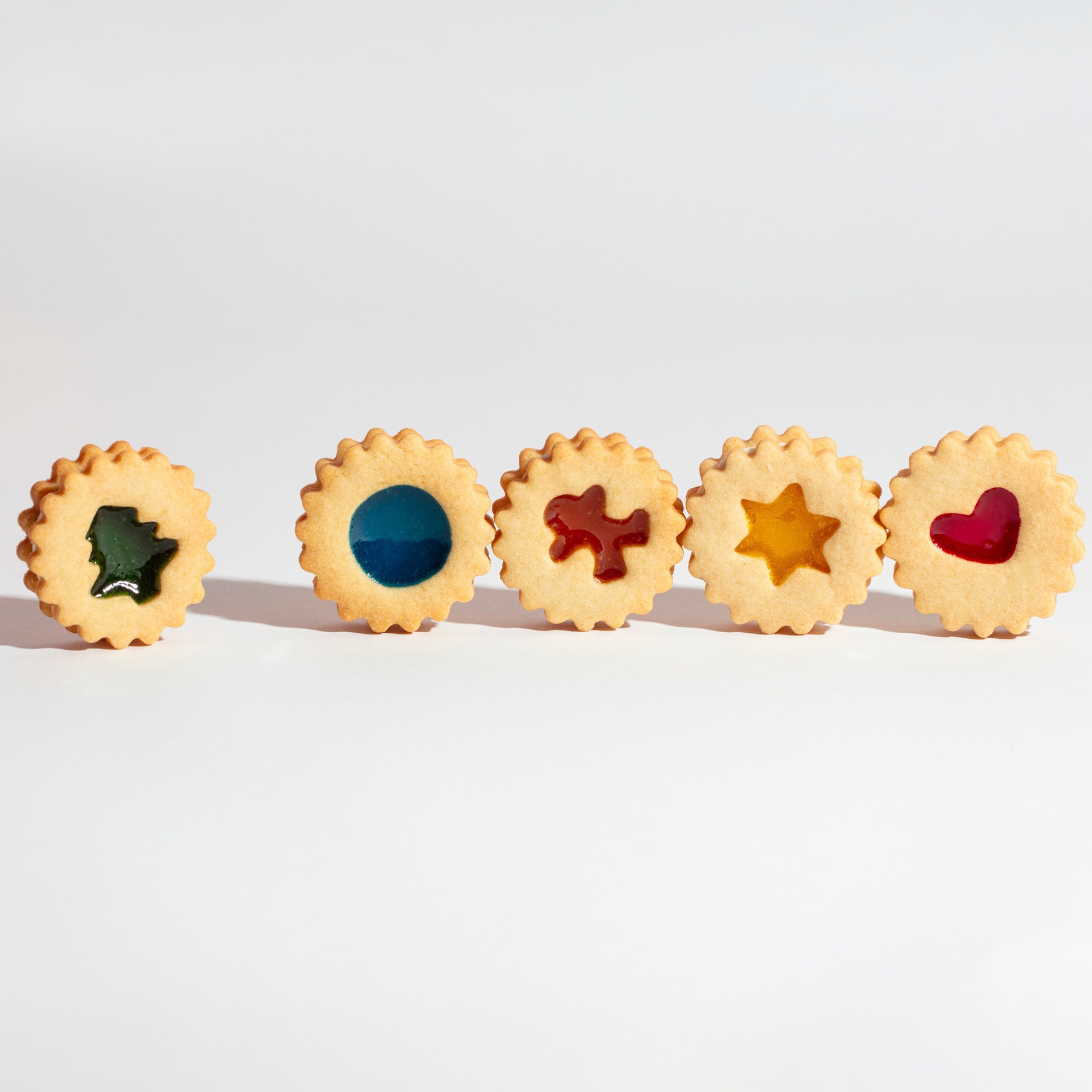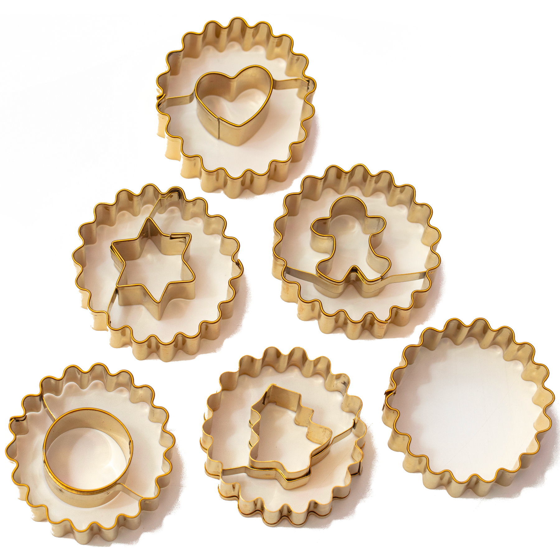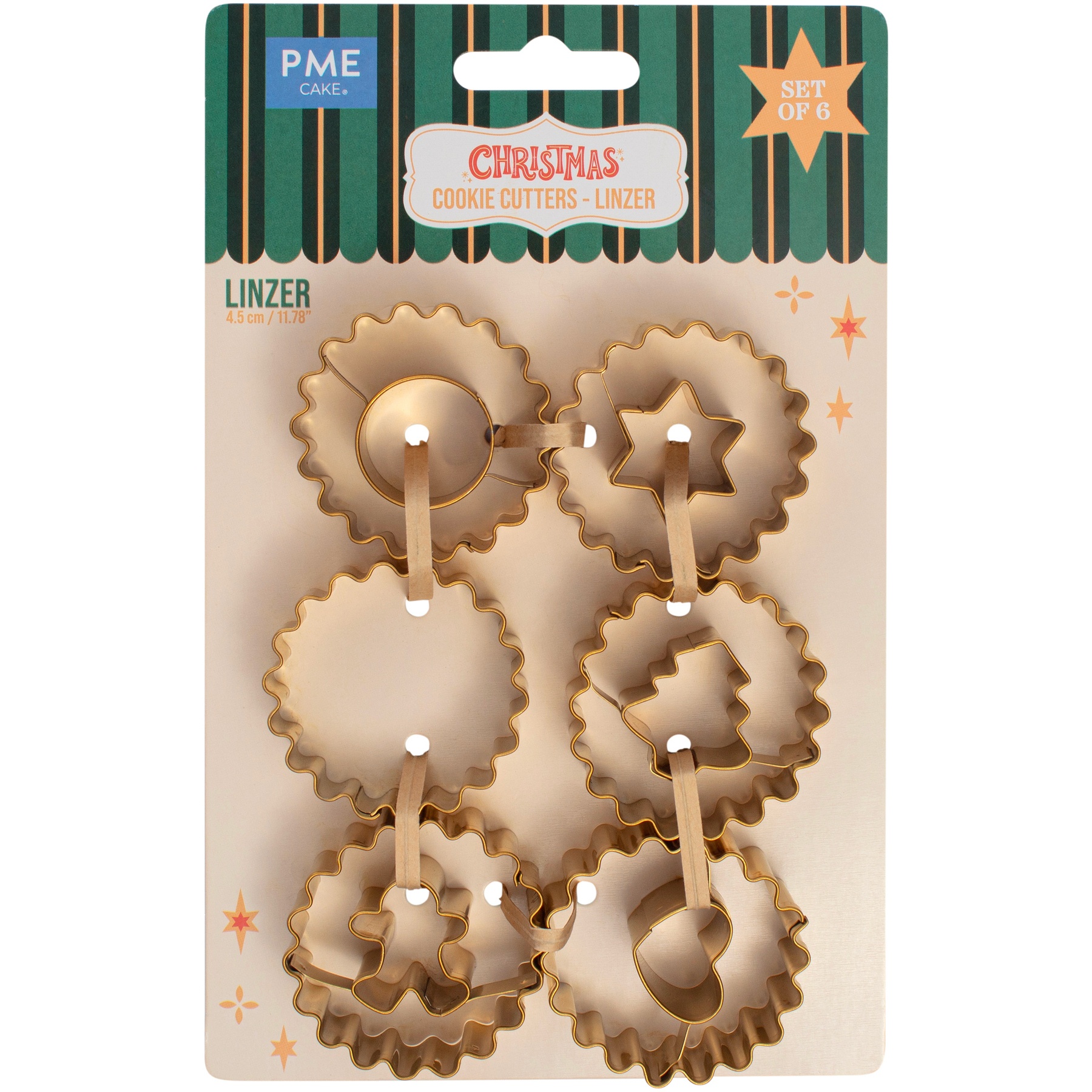 • 6 metallische Ausstechformen mit einem schönen goldenen Finish, darunter ein Stern, ein Herz, ein Lebkuchenmann, ein Weihnachtsbaum, ein Kreis und ein glatter Ausstecher für die Basis der Linzer Kekse.