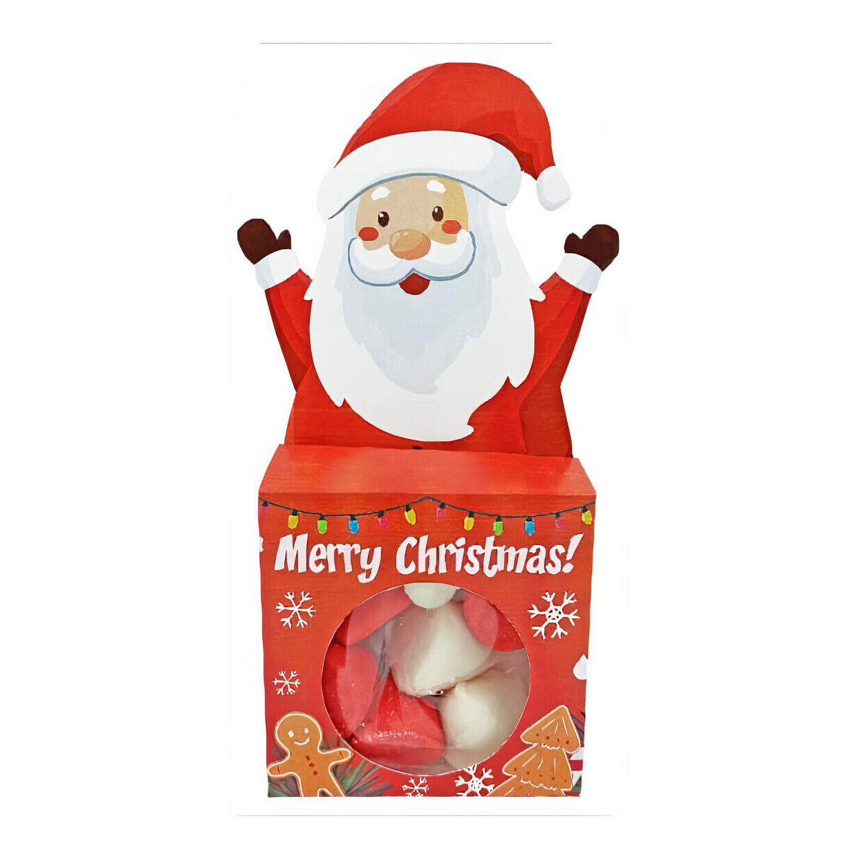 Pappfigur mit einem Bild von Weihnachtsmann, in der sich eine kleine Tüte mit roten und weißen Wolken befindet, ideal als Weihnachtsgeschenk.