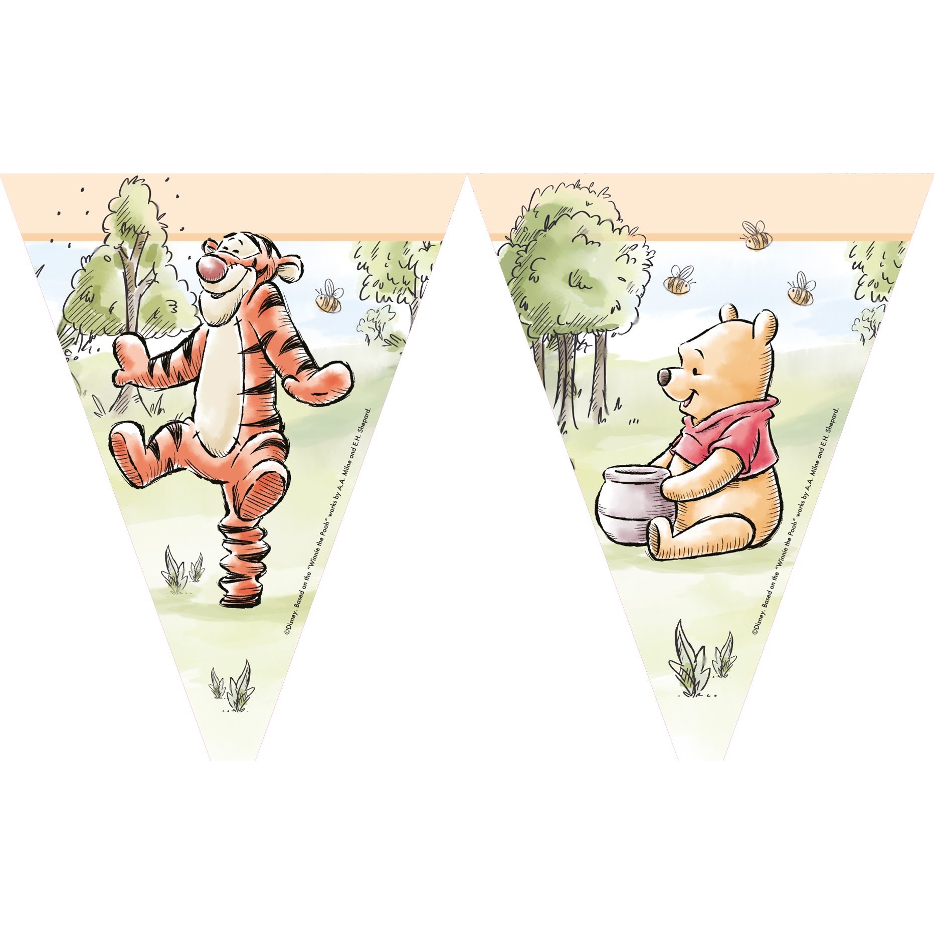Dekorativer Wimpel mit Illustrationen von Winnie the Pooh und Tigger im Naturdesign - ideal, wenn Sie Kindergeburtstage stimmungsvoll gestalten möchten.