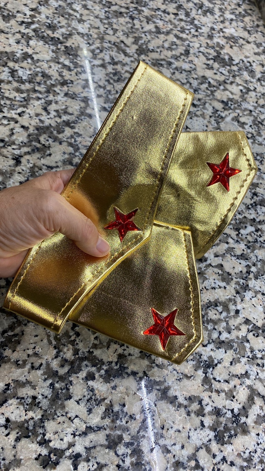 Dieses Produkt besteht aus einem goldfarbenen Diadem mit elastischen Bändern auf der Rückseite und einem roten Stern auf der Vorderseite. Die Armbänder sind ebenfalls goldfarben und haben rote Sterne an beiden Armen, ganz im Stil von Wonder Woman.