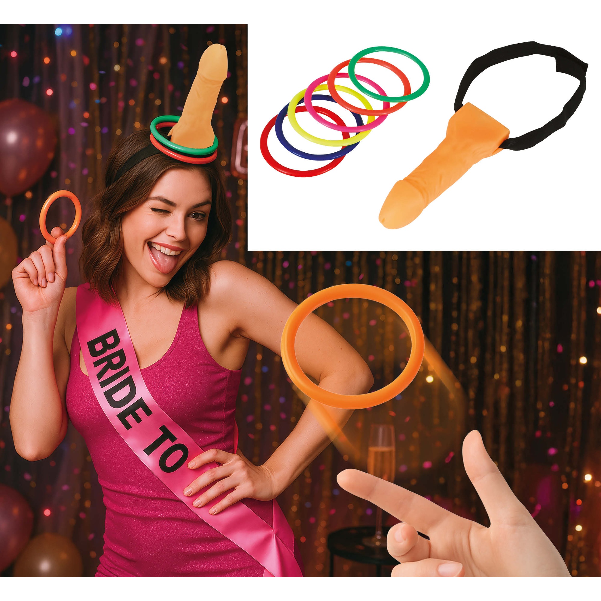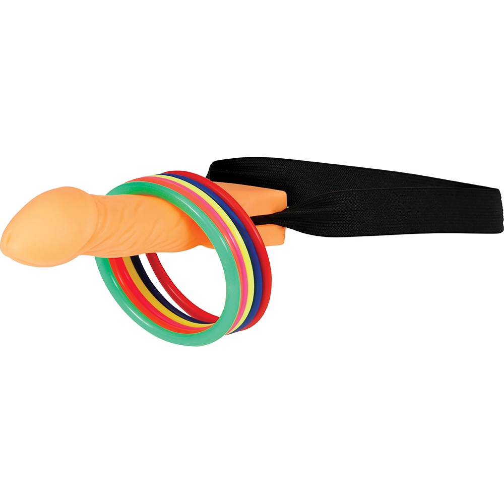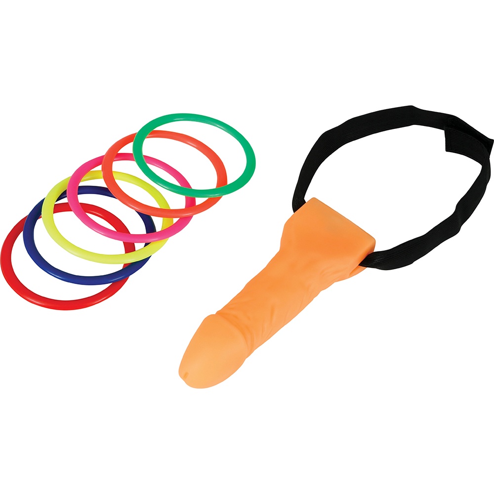 Wurfspiel mit frechem und unterhaltsamem Design. Es verfügt über ein penisförmiges Ziel und farbige Ringe zum Werfen - konzipiert, um Ihre privaten Feiern und Junggesellenabschiede für Erwachsene aufzulockern.