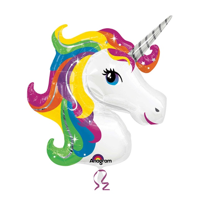 Ein großer Metallballon mit der Silhouette eines Einhornkopfes mit seiner bunten Mähne und den Hörnern auf der Stirn.