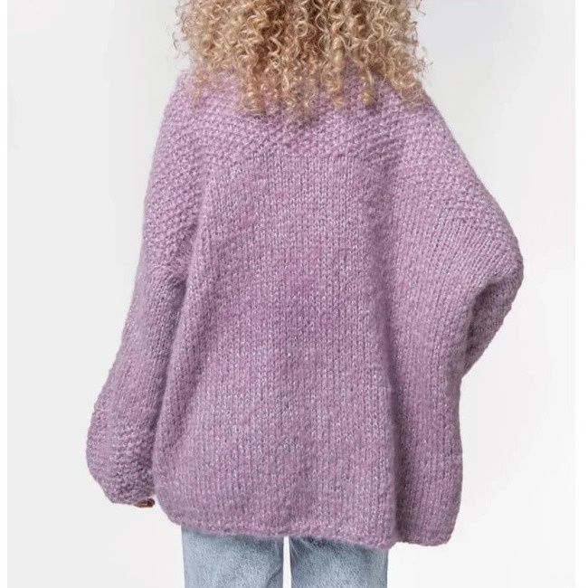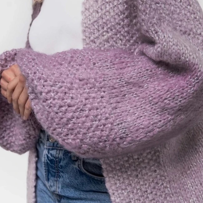 - Sie finden Erklärungen, um eine Strickjacke mit breiten Rändern und einem Oberteil in Reiskornmuster zu stricken, verziert mit Puffärmeln und Reiskornmuster an den Bündchen.
