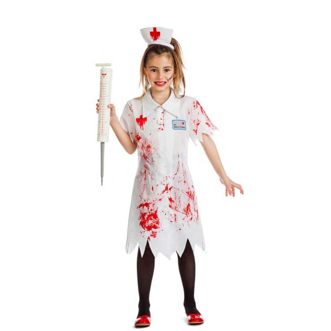 Verkleiden Sie sich als Zombie-Krankenschwester mit diesem weißen, rot gefärbten Kittel, der Blut imitiert. Es ist mit dem Krankenschwester-Zeichen von Débora Cabezas versehen, einem witzigen Detail, das dem Kostüm eine besondere Note verleiht.